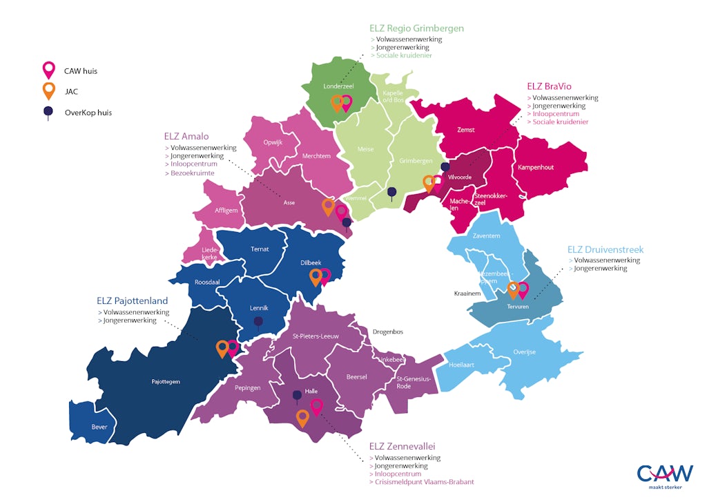6 CAW huizen / 6 JAC’s / 3 inloophuizen / 1 Bezoekruimte / 5 OverKop / 1 CMP / 1 Sociale Kruidenier/ extra CAW- en JAC-punten